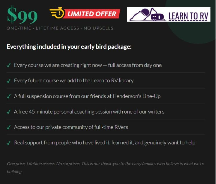 Grab the entire Learn To RV course bundle for just $99 before the early‑bird window closes (Presale prices increase after April 5, 2026)— this price of only $99 will never come back, and neither will this opportunity. Join us inside the Learn to RV community and be part of the very first group shaping this course from the ground up. Your journey matters, and we’d love to walk it with you.