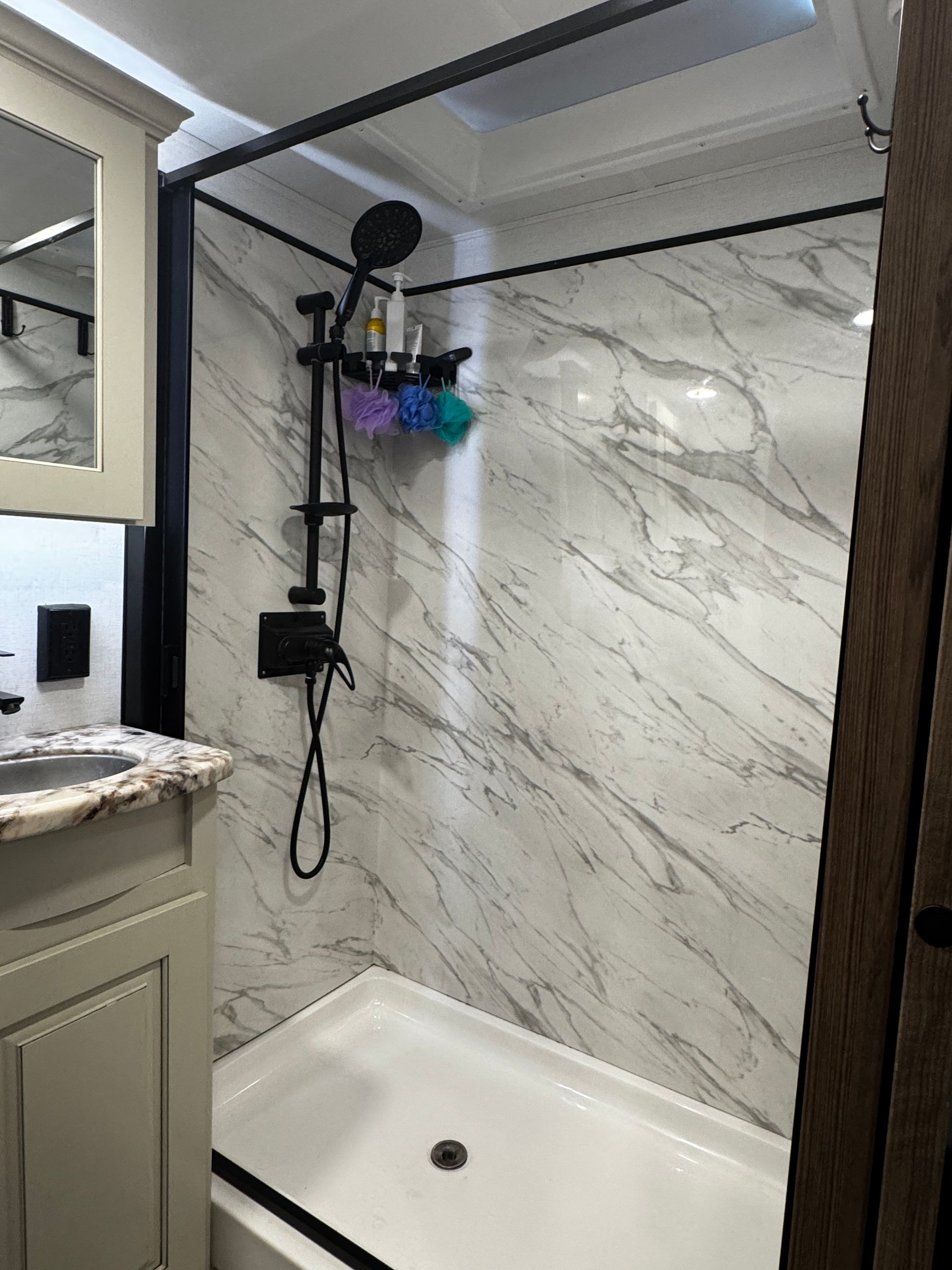 The reason? Those heavy glass doors that come standard in many RVs are not only bulky, they can also be a little scary. In our motorhome ours shattered—randomly, out of the blue—and it was an absolute mess to clean up. That was enough for me to swear I’d never deal with glass shower doors again.
