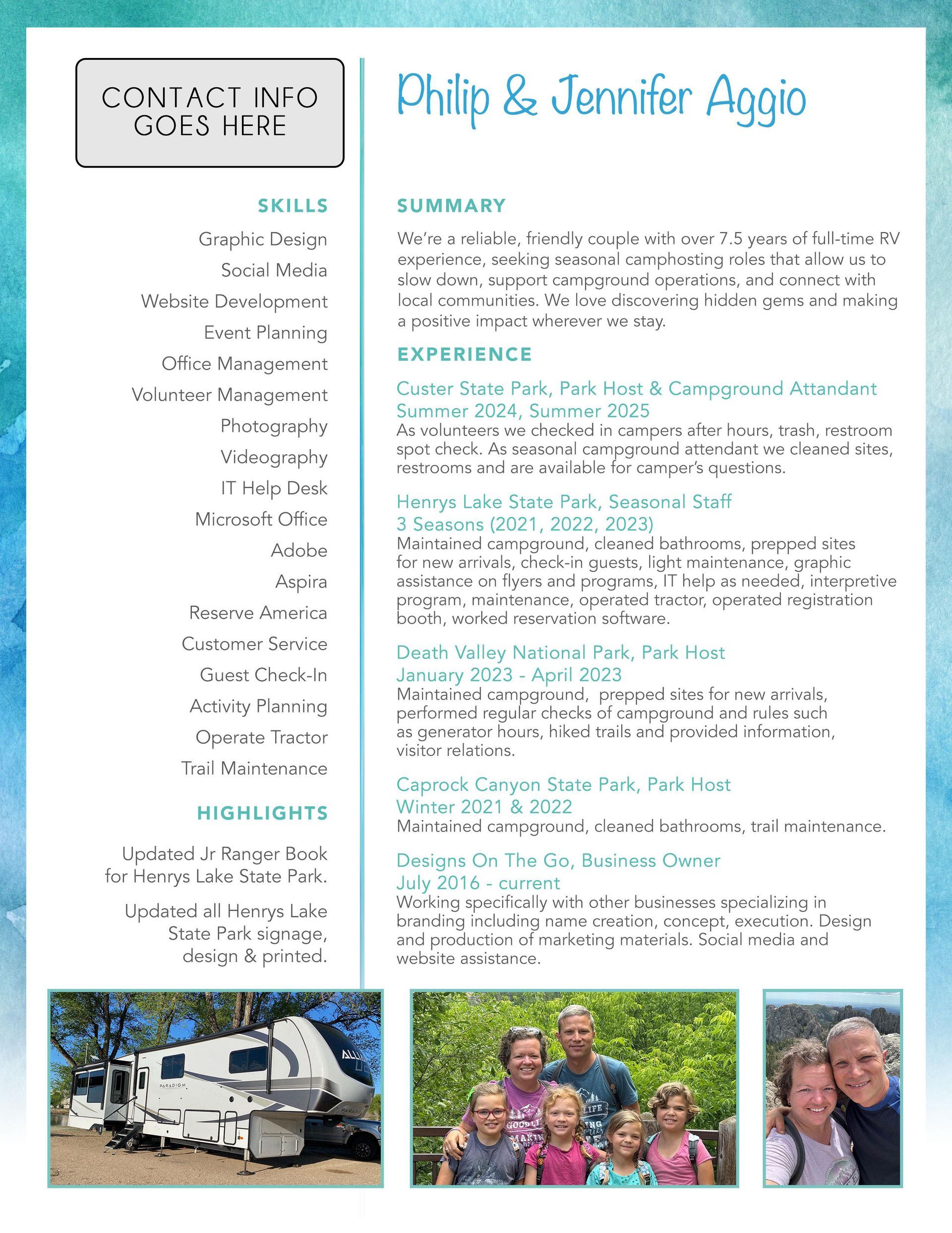 We're writing to express our interest in the Camp Host position at [Campground Name] for the summer season. We've been full-time RVers for five years, traveling in our 35' fifth wheel, and we're drawn to [specific reason—beautiful location, family-friendly atmosphere, etc.].